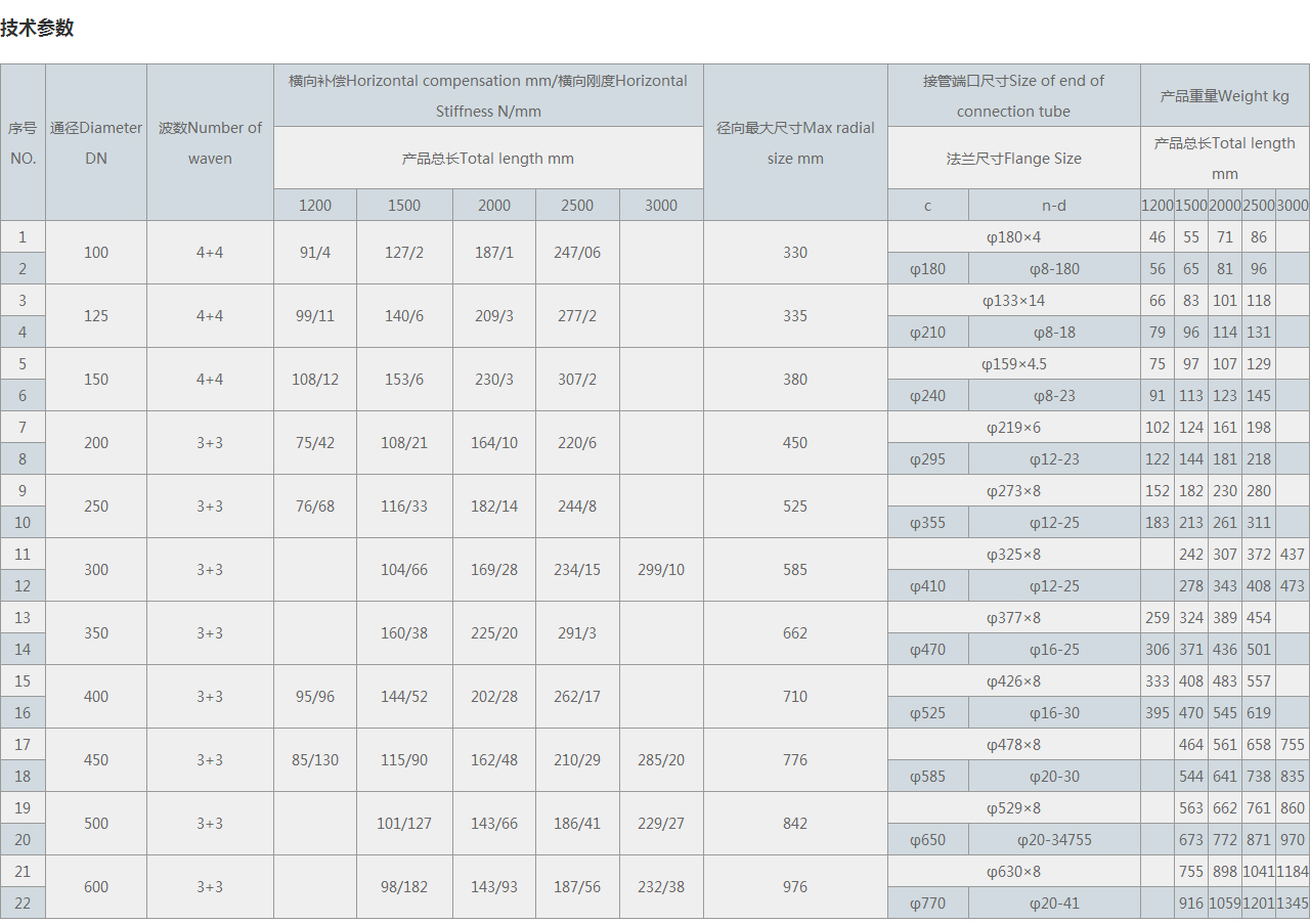 | 序號NO. | 通徑Diameter DN | 波數(shù)Number of waven | 橫向補償Horizontal compensation mm/橫向剛度Horizontal Stiffness N/mm | 徑向很大尺寸Max radial size mm | 接管端口尺寸Size of end of connection tube | 產(chǎn)品重量Weight kg | |||||||||