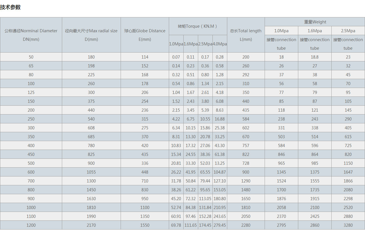 | 公稱通徑Norminal Diameter DN(mm) | 徑向很大尺寸Max radial size D(mm) | 球心距Globe Distance E(mm) | 轉(zhuǎn)矩Torque(KN.M) | 總長(zhǎng)Total length L(mm) | 重量Weight | |||||