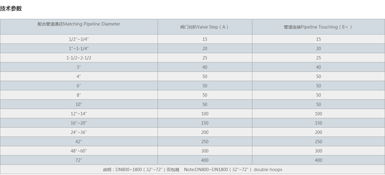 | 說(shuō)明:DN800~1800(32″~72″)雙包箍 Note:DN800~DN1800(32″~72″) double hoops | ||
