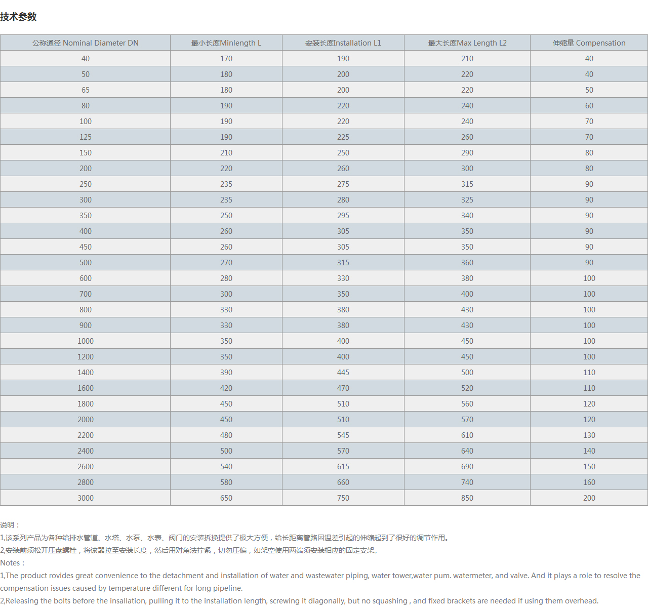 | 公稱通徑 Nominal Diameter DN | 很小長度Minlength L | 安裝長度Installation L1 | 很大長度Max Length L2 | 伸縮量 Compensation |