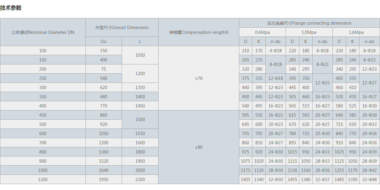 | 公稱通徑Norminal Diameter DN | 外型尺寸Overall Dimension | 伸縮量Compensation-lengthδ | 法蘭連接尺寸Flange connecting dimension | |||||||||