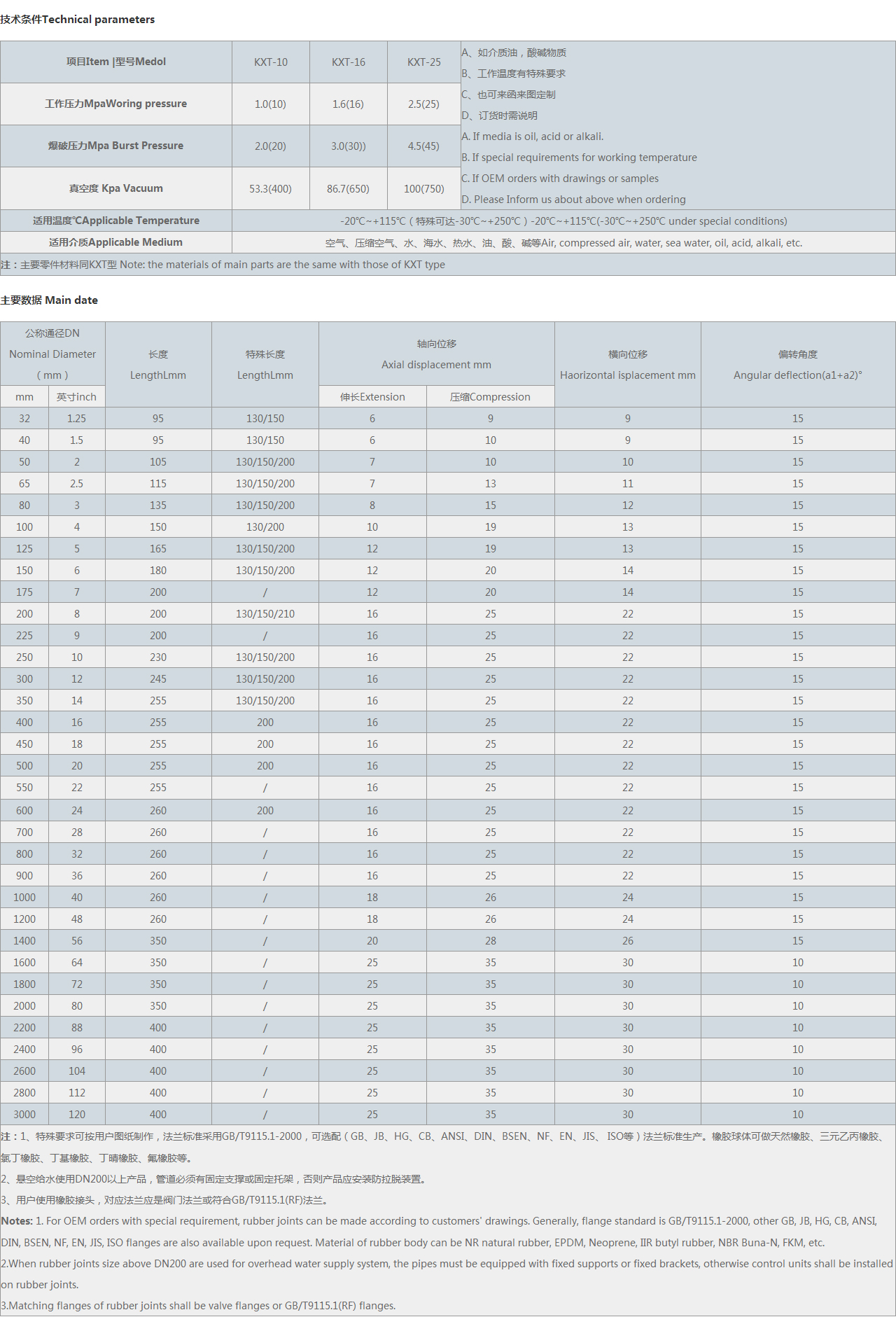 | 注:1、特殊要求可按用戶圖紙制作,可選配(GB、JB、HG、CB、ANSI、DIN、BSEN、NF、EN、JIS、 等)法蘭標準生產(chǎn)。橡膠球體可做天然橡膠、三元乙丙橡膠、氯丁橡膠、丁基橡膠、丁晴橡膠、氟橡膠等。 2、懸空給水使用DN200以上產(chǎn)品,管道必須有固定支撐或固定托架,否則產(chǎn)品應安裝防拉脫裝置。 3、用戶使用橡膠接頭,對應法蘭應是閥門法蘭。 Notes: 1. For OEM orders with special requirement, rubber joints can be made according to customers' drawings. Generally, flange standard is , other GB, JB, HG, CB, ANSI, DIN, BSEN, NF, EN, JIS, flanges are also available upon request. Material of rubber body can be NR natural rubber, EPDM, Neoprene, IIR butyl rubber, NBR Buna-N, FKM, etc. 2.When rubber joints size above DN200 are used for overhead water supply system, the pipes must be equipped with fixed supports or fixed brackets, otherwise control units shall be installed on rubber joints. 3.Matching flanges of rubber joints shall be valve flanges or flanges. |