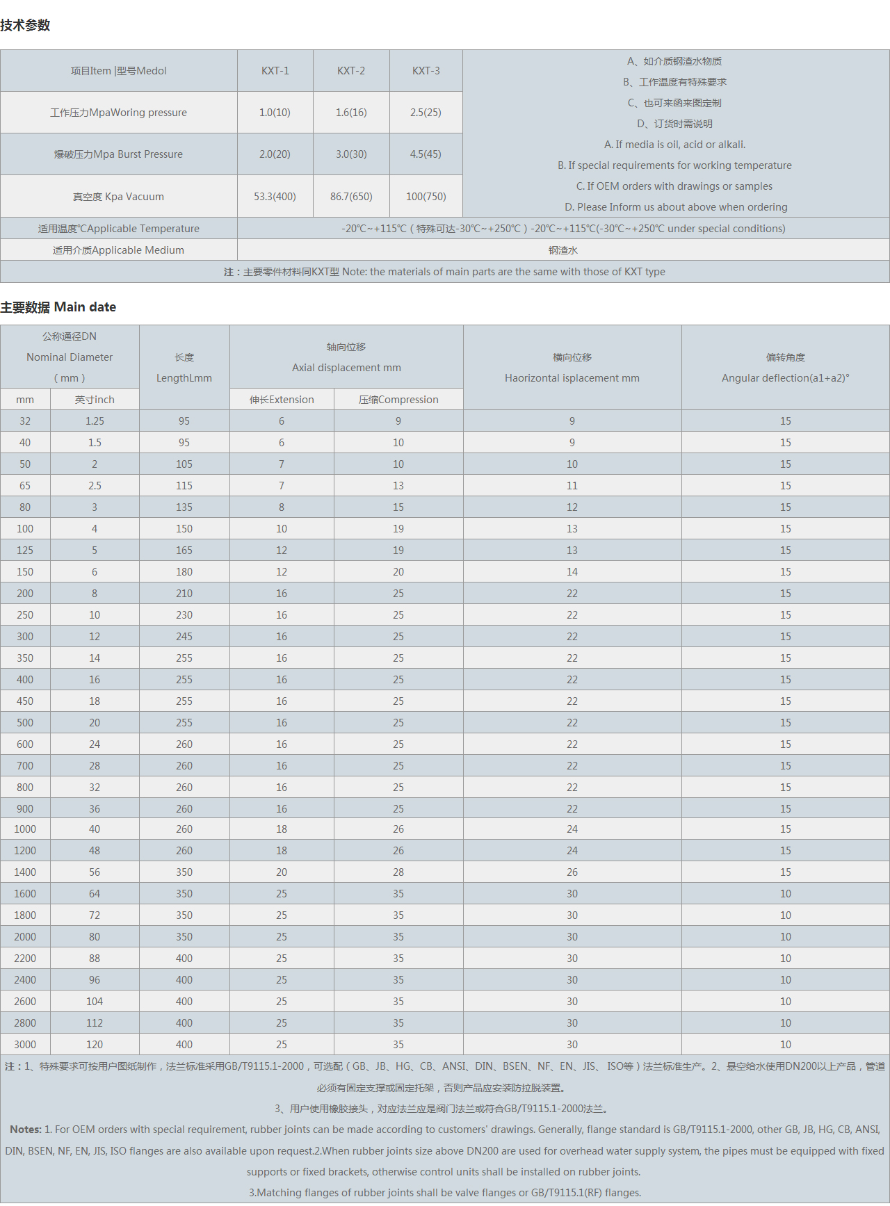 | 注:1、特殊要求可按用戶圖紙制作,可選配(GB、JB、HG、CB、ANSI、DIN、BSEN、NF、EN、JIS、 等)法蘭標(biāo)準(zhǔn)生產(chǎn)。2、懸空給水使用DN200以上產(chǎn)品,管道必須有固定支撐或固定托架,否則產(chǎn)品應(yīng)安裝防拉脫裝置。 3、用戶使用橡膠接頭,對應(yīng)法蘭應(yīng)是閥門法蘭。 Notes: 1. For OEM orders with special requirement, rubber joints can be made according to customers' drawings. Generally, flange standard is , other GB, JB, HG, CB, ANSI, DIN, BSEN, NF, EN, JIS, flanges are also available upon request.2.When rubber joints size above DN200 are used for overhead water supply system, the pipes must be equipped with fixed supports or fixed brackets, otherwise control units shall be installed on rubber joints. 3.Matching flanges of rubber joints shall be valve flanges or flanges. |