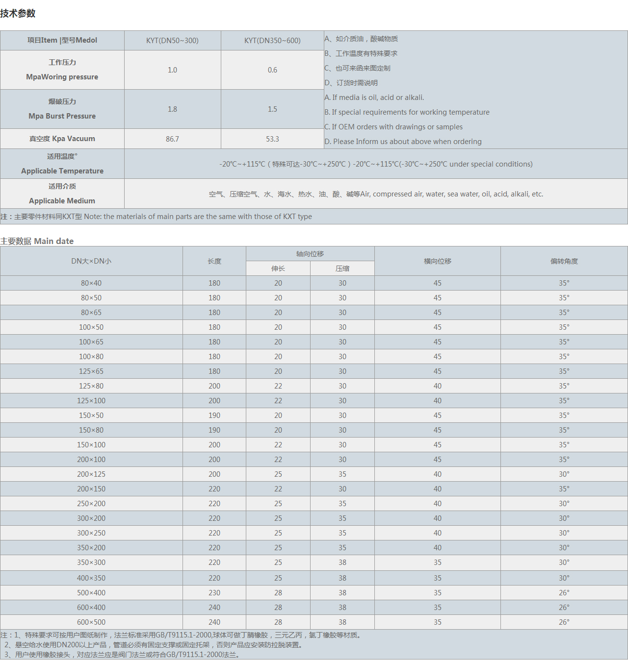 | 項(xiàng)目Item |型號(hào)Medol | KYT(DN50~300) | KYT(DN350~600) | A、如介質(zhì)油,酸堿物質(zhì) B、工作溫度有特殊要求 C、也可來(lái)函來(lái)圖定制 D、訂貨時(shí)需說(shuō)明 A. If media is oil, acid or alkali. B. If special requirements for working temperature C. If OEM orders with drawings or samples D. Please Inform us about above when ordering |